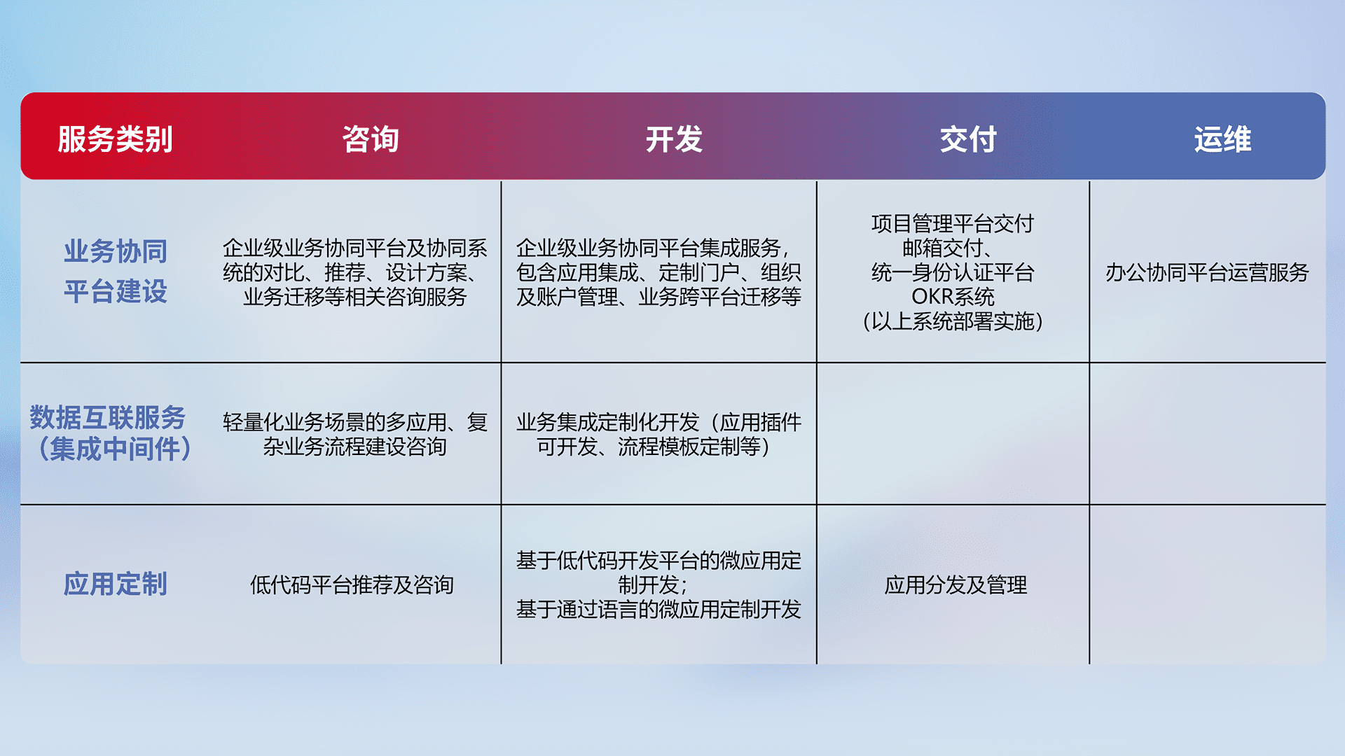 针对钉钉、、、、企微、、、、IDaas等平台级产品提供产品的规划、、方案、、、交付、、定制化开发等服务,,实现如统一协同办公、、、智能客户服务、、、混合会议管理、、智能数据查询、、、等业务场景,,,,实现数字化转型。。。