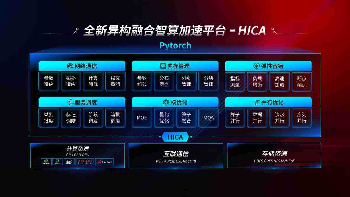 通过自研的服务层、、、中间适配层、、以及调度编排算法,,,采用数据并行、、模型并行等多种并行方式,,,,把并行计算任务进行有效的分解,,使其分别由相应的软件栈和算力资源来承接。。。当GPU资源变化,,,,HICA可以实时动态调度计算子任务并调整模型拓扑和架构,,,以充分聚合各种算力资源。。。。