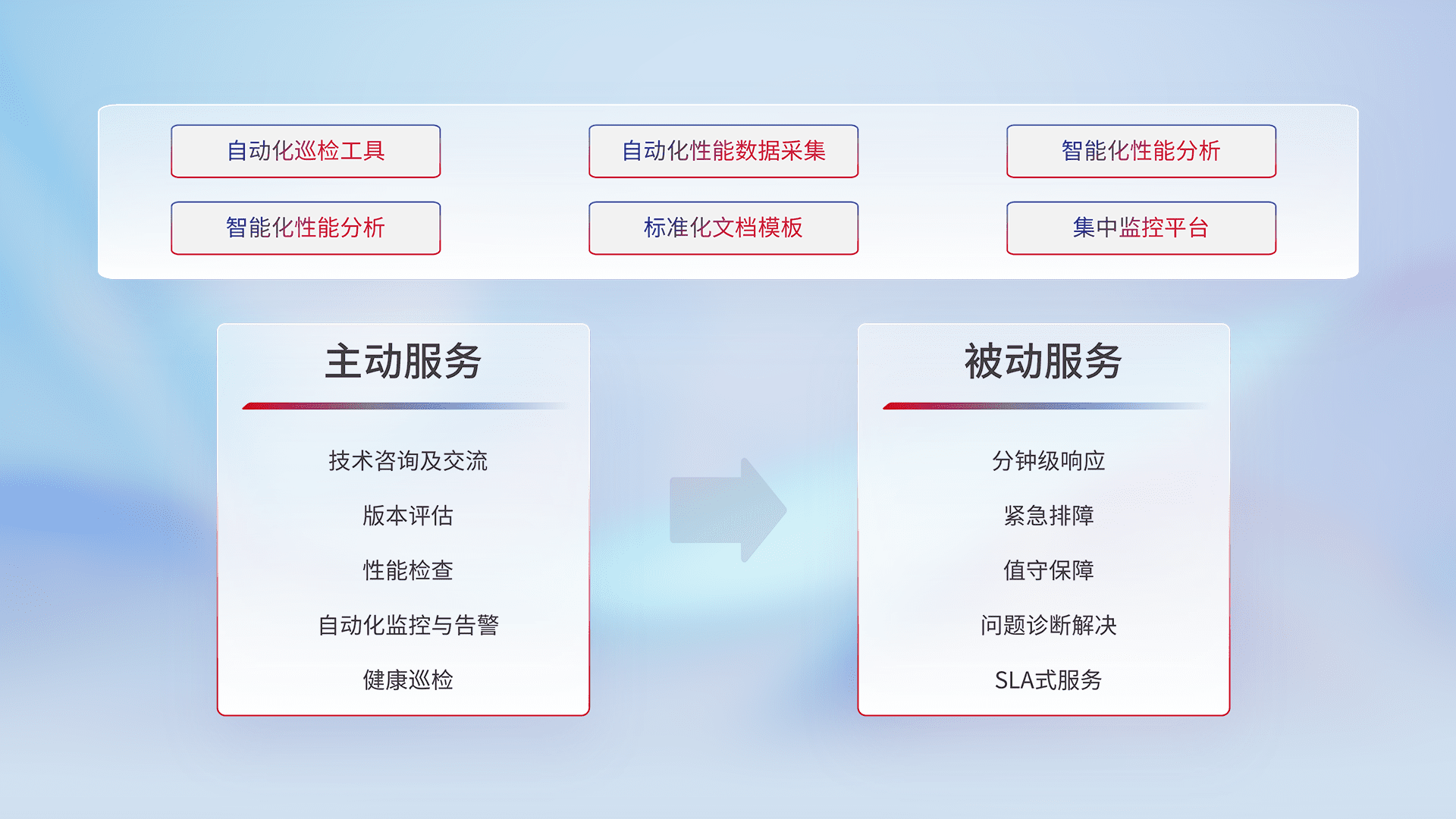 智能化工具和标准化文档,,保障服务质量,,,,提供主动服务(包含技术咨询、、、、版本评估、、性能检查、、自动化监控与告警、、健康巡检)和被动服务包含(分钟级响应、、紧急排障、、值守保障、、、问题诊断解决、、、、SLA服务)。。。。